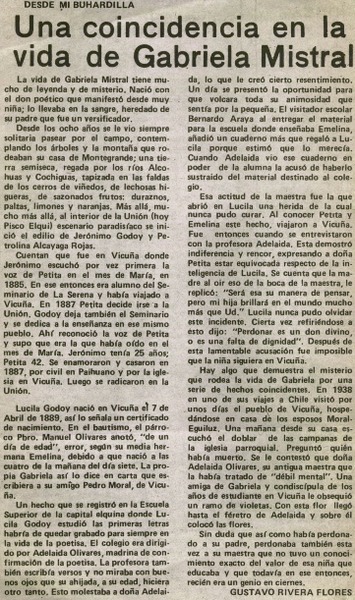 Una coincidencia en la vida de Gabriela Mistral [artículo] Gustavo Rivera Flores.