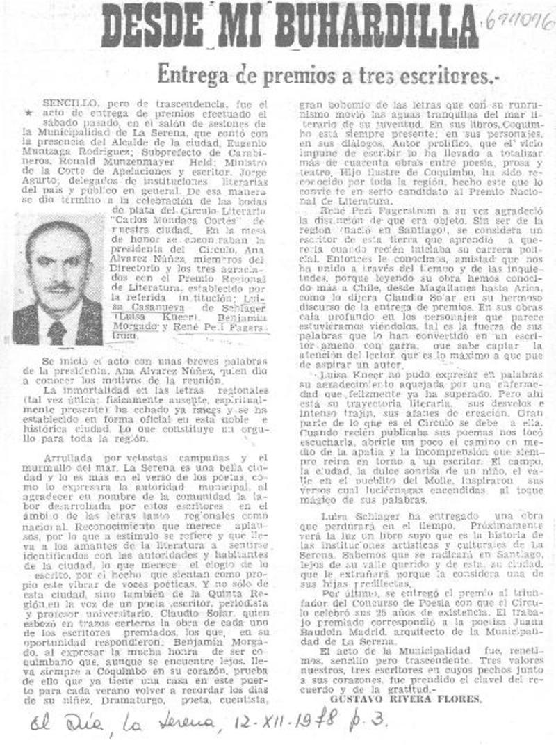 Entrega de premios a tres escritores [artículo] Gustavo Rivera Flores.