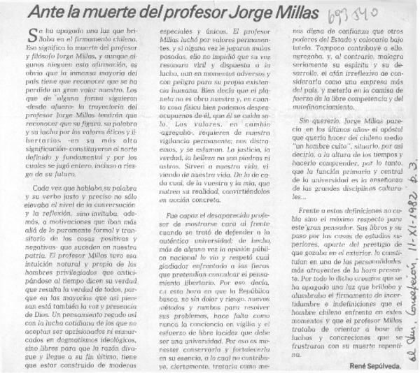 Ante la muerte del profesor Jorge Millas [artículo] René Sepúlveda.