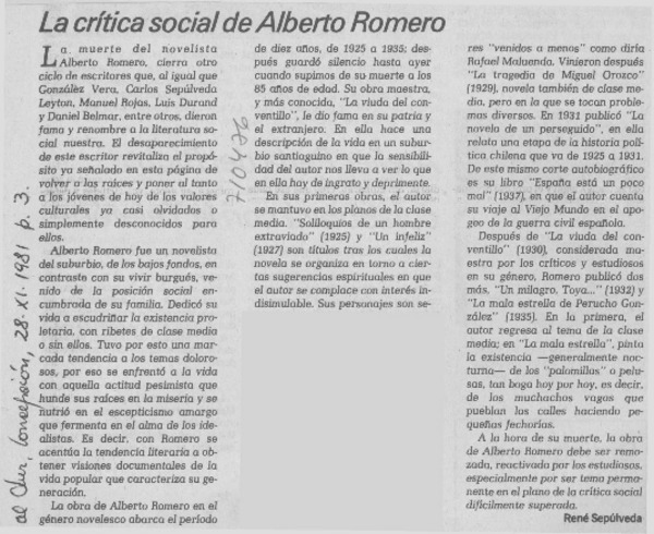 La crítica social de Alberto Romero [artículo] René Sepúlveda.