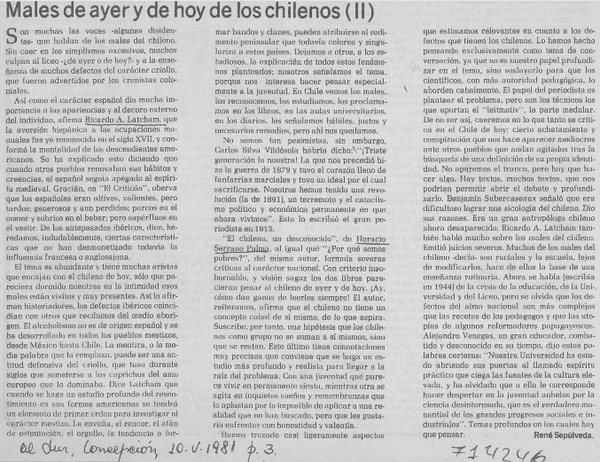 Males de ayer y de hoy de los chilenos (II) [artículo] René Sepúlveda.