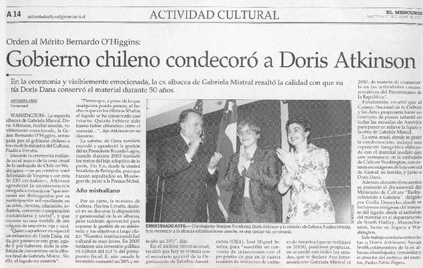 Gobierno chileno condecoró a Doris Atkinson [artículo] Antonieta Cádiz.