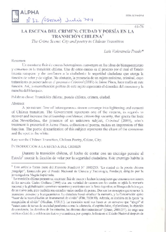 La escena del crimen : ciudad y poesía en la transición chilena [artículo] Luis Valenzuela Prado.