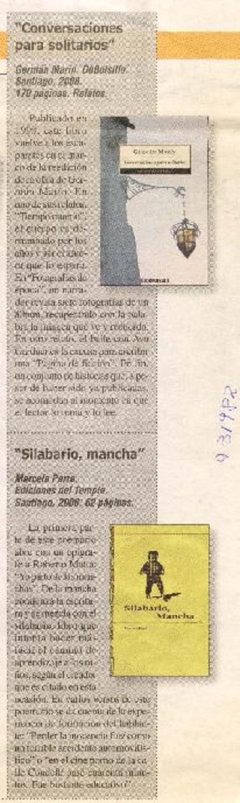 Autores chilenos - Marín, Germán - Conversaciones para solitarios - Parra, Marcela - Silabario, mancha