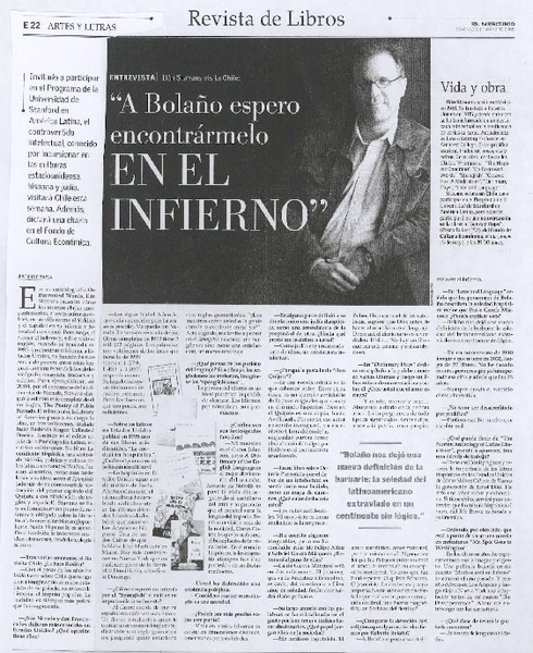 "A Bolaño espero encontrármelo en el infierno" (entrevista) [artículo] Patricio Tapia.