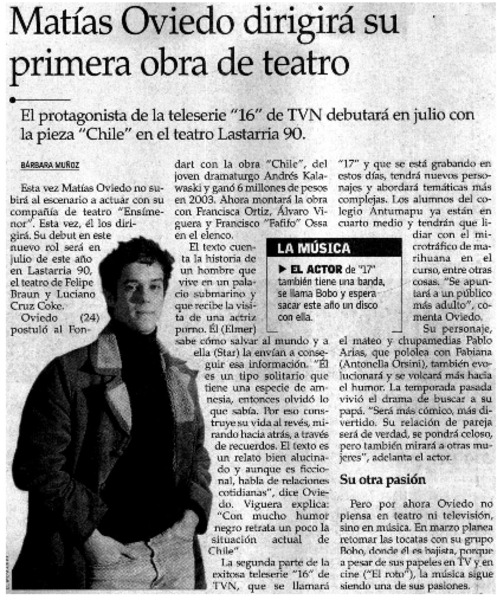 Matías Oviedo dirigirá su primera obra de teatro [artículo] Bárbara Muñoz.