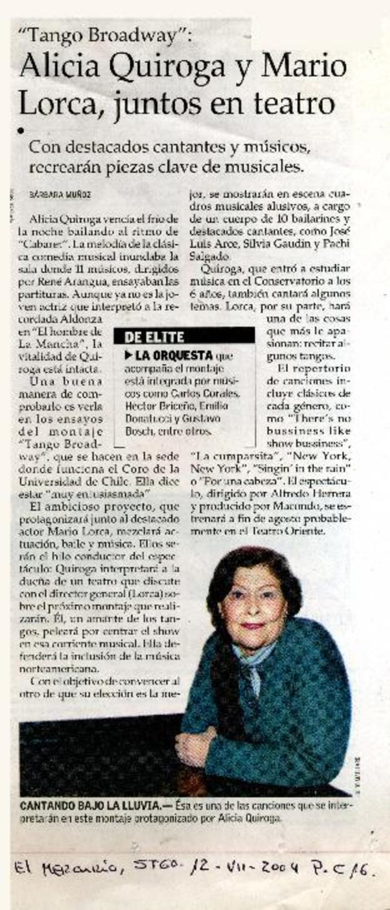 Alicia Quiroga y Mario Lorca, juntos en teatro [artículo] Bárbara Muñoz.