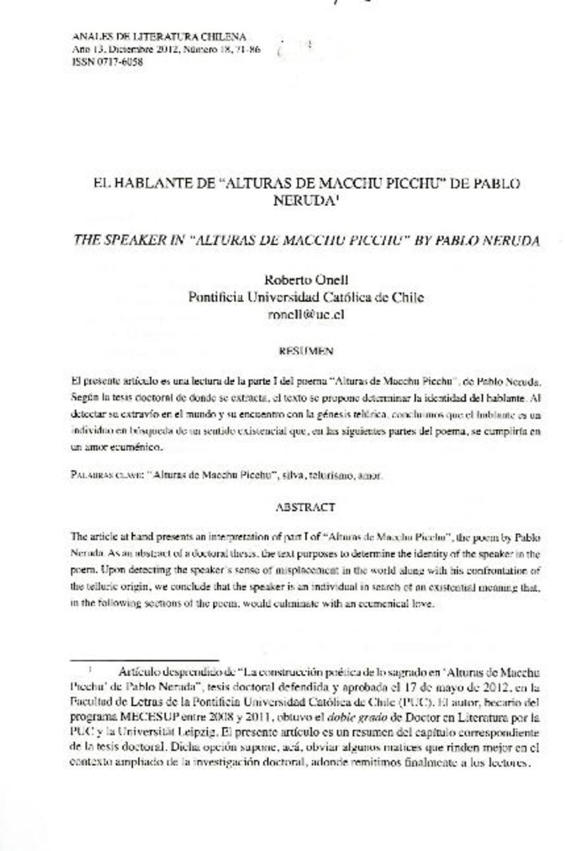 El hablante de "Alturas de Macchu Picchu" de Pablo Neruda [artículo] Roberto Onell