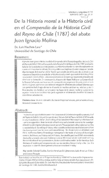 De la Historia moral a la Historia civil en el Compendio de la Historia civil del Reyno de Chile (1787) del abate Juan Ignacio Molina [artículo] Luis Hachim Lara.