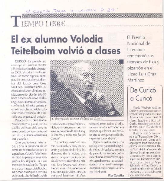 El ex alumno Volodia Teitelboim volvió a clases [artículo] Pilar González.