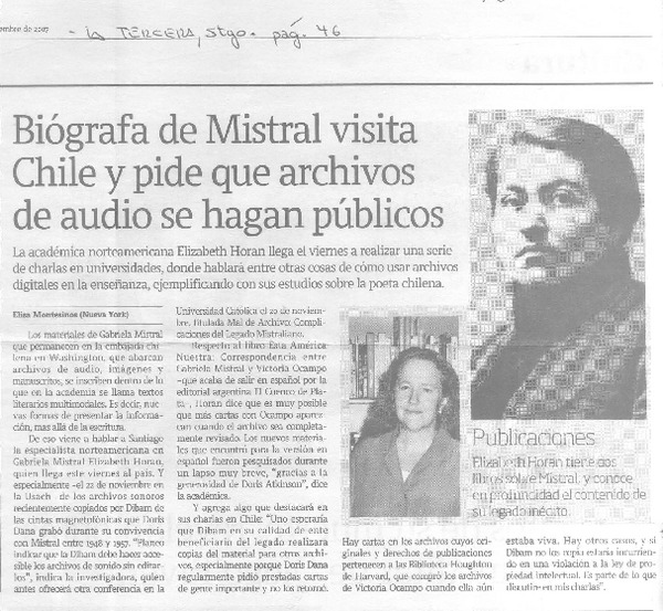 Biógrafa de Mistral visita Chile y pide que archivos de audio [artículo] Elisa Montesinos.