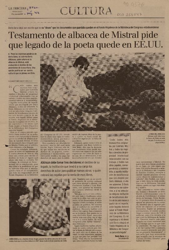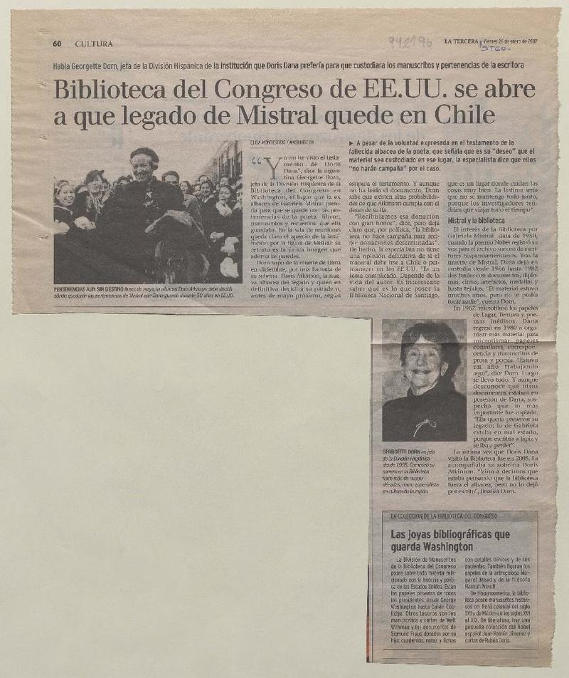 Biblioteca del Congreso de EE.UU. se abre a que legado de Mistral quede en Chile [artículo] Elisa Montesinos.