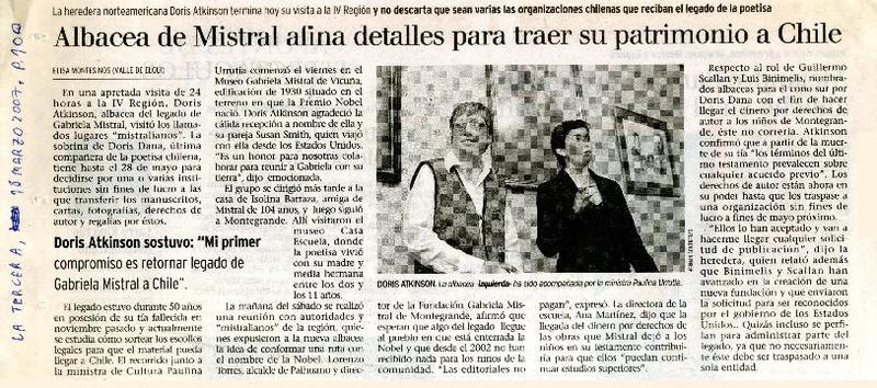 Bachelet agradeció a Doris Atkinson la donación a Chile del legado de Mistral [artículo] Elisa Montesinos.