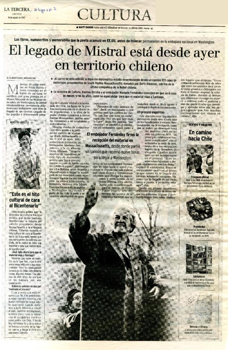 El legado de Mistral está desde ayer en territorio chileno [artículo] Elisa Montesinos.