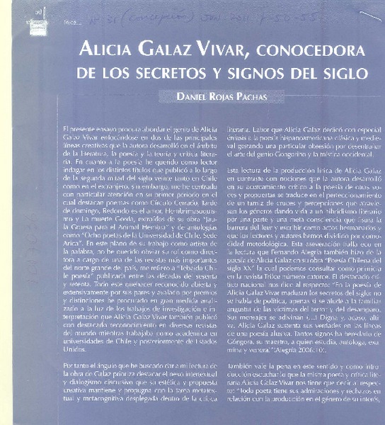 Alicia Galaz Vivar, conocedora de los secretos y signos del siglo [artículo] Daniel Rojas Pachas.