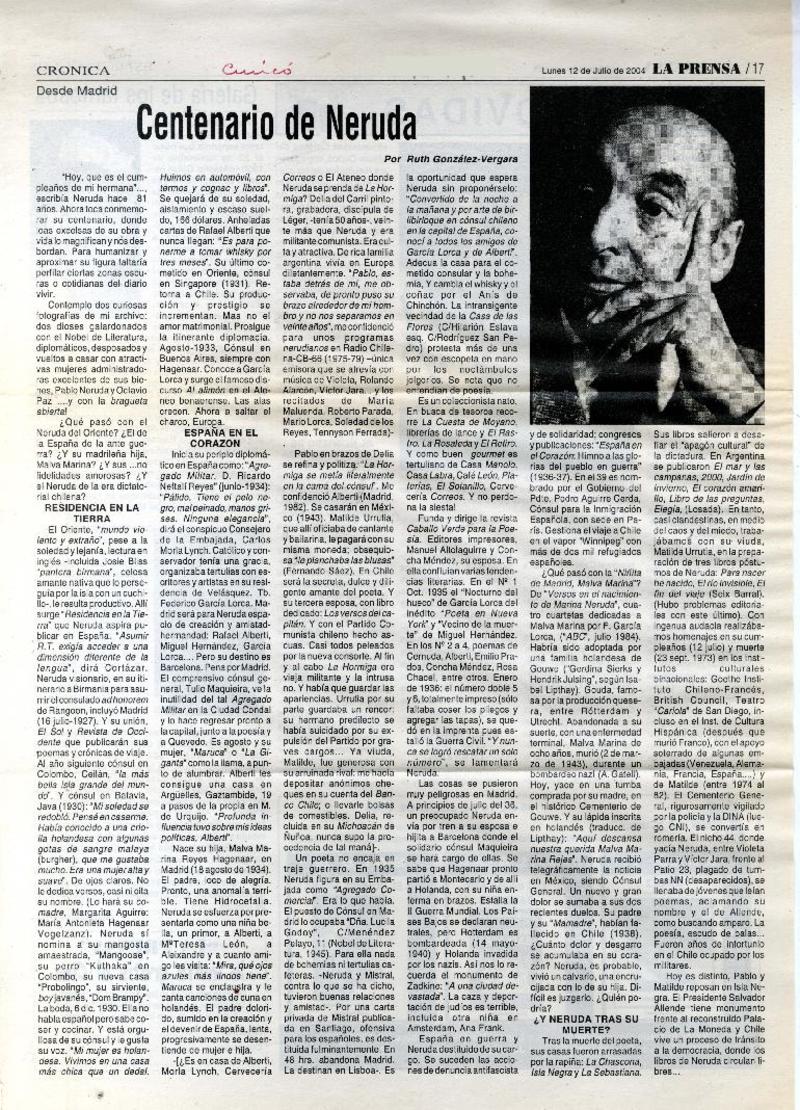 Centenario de Neruda [artículo] Ruth González Vergara.