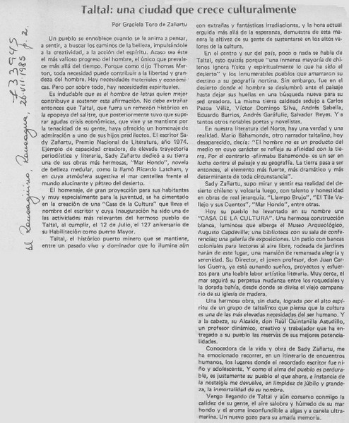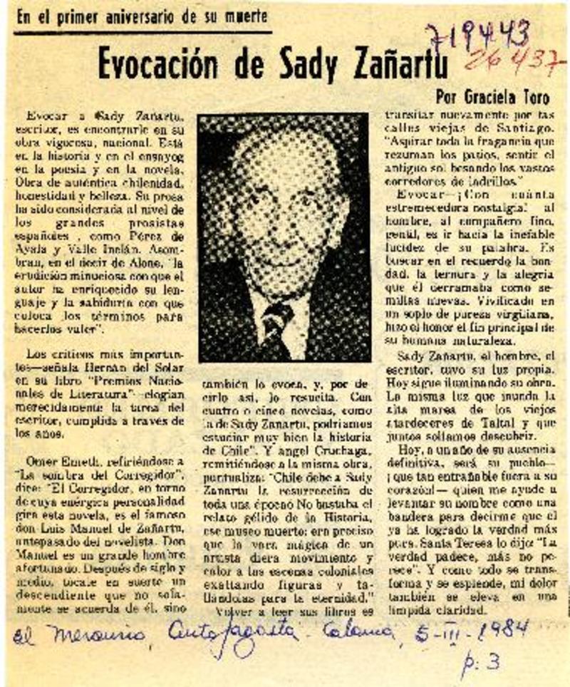 Evocación de Sady Zañartu [artículo] Graciela Toro.