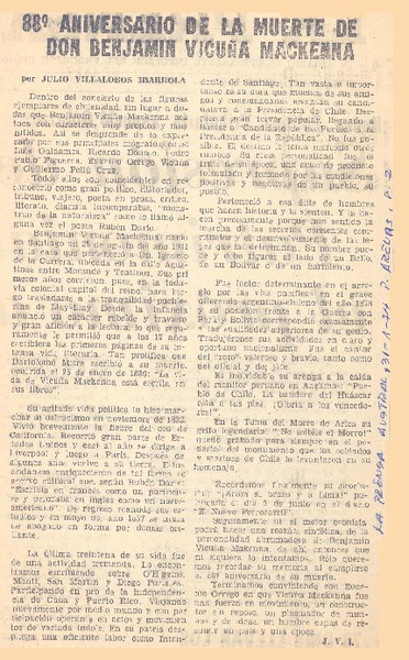 88° aniversario de la muerte de don Benjamín Vicuña Mackenna [artículo] Julio Villalobos Ibarrola.