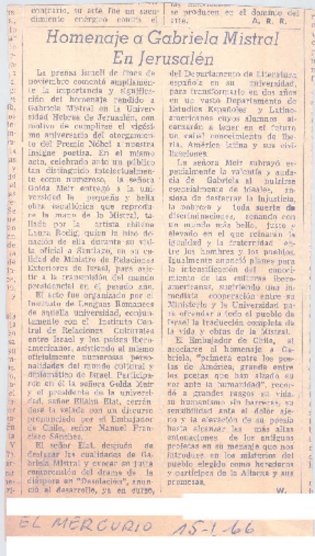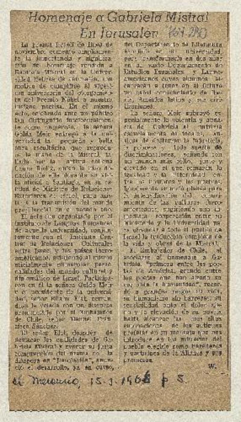Homenaje a Gabriela Mistral en Jerusalén [artículo] W.
