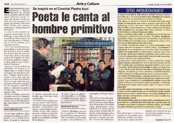 Poeta le canta al hombre primitivo [artículo] Paulina Ossa M.