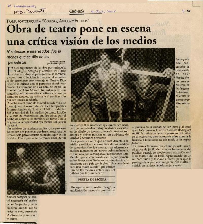 Trama portorriqueña "Colegas, amigos y vecinos" : obra de teatro pone en escena una crítica visión de los medios [artículo] Paulina Ossa M.