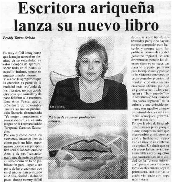 Escritora ariqueña lanza se nuevo libro [artículo] Freddy Torres Oviedo.