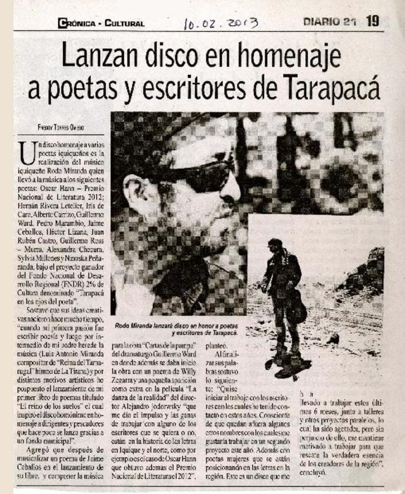 Lanzan disco en homenaje a poetas y escritores de Tarápaca [artículo] Freddy Torres Oviedo