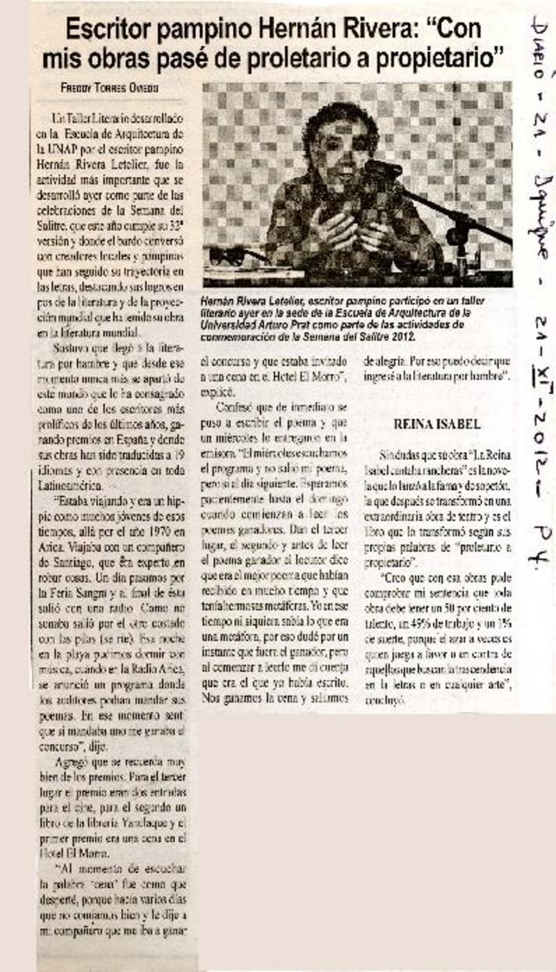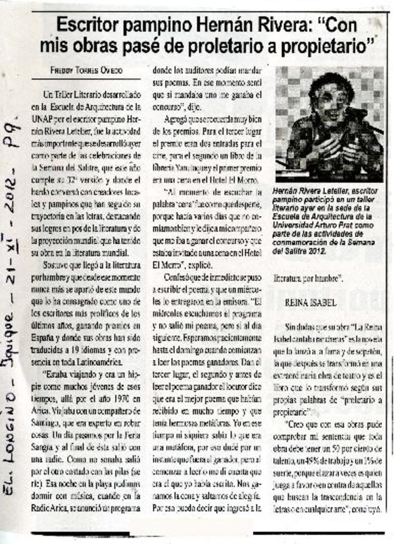 Escritor pampino Hernán Rivera: "Con mis obras pasé de proletario a propietario" [artículo] Freddy Torres Oviedo.