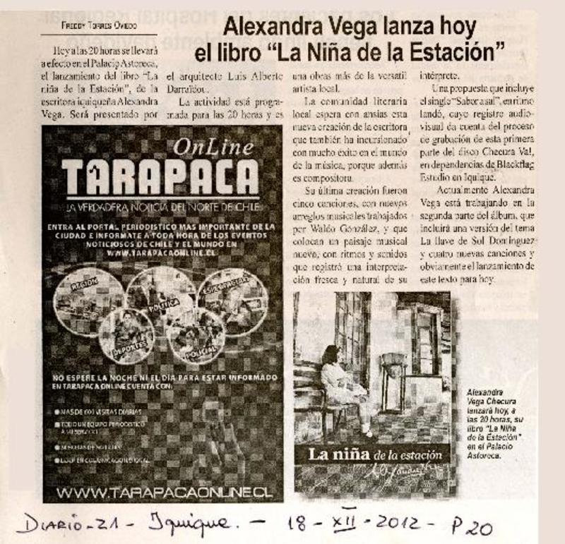 Alexandra Vega lanza hoy el libro "La niña de la estación" [artículo] Freddy Torres Oviedo.
