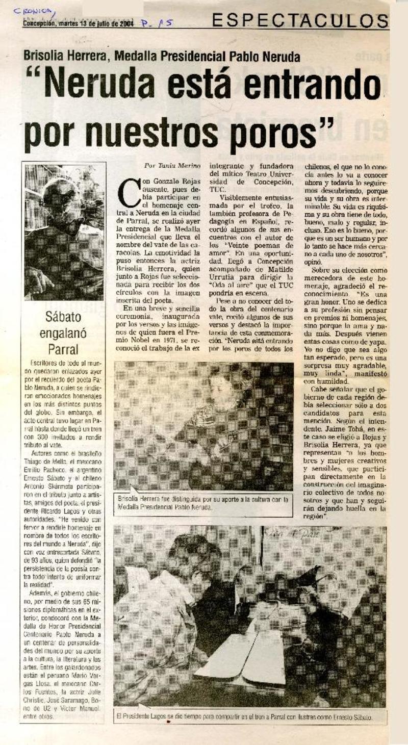 "Neruda está entrando por nuestros poros" Brisolia Herrera, medalla Presidencial Pablo Neruda [artículo] : Tania Merino.
