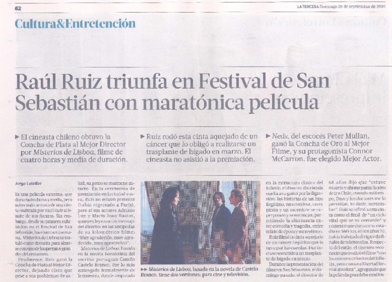 Raúl Ruiz triunfa en Festival de San Sebastián con maratónica película [artículo] Jorge Letelier.