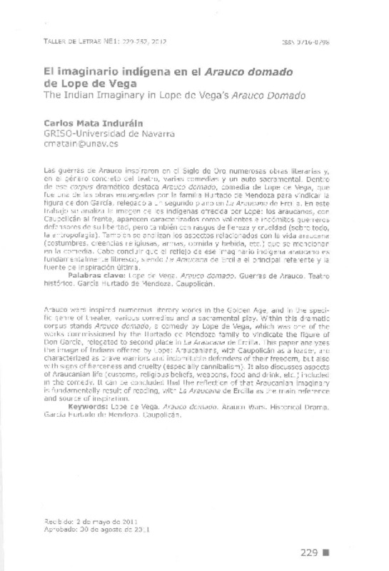 El imaginario indígena en el Arauco domado de Lope de Vega [artículo] CArlos Mara Induraín.