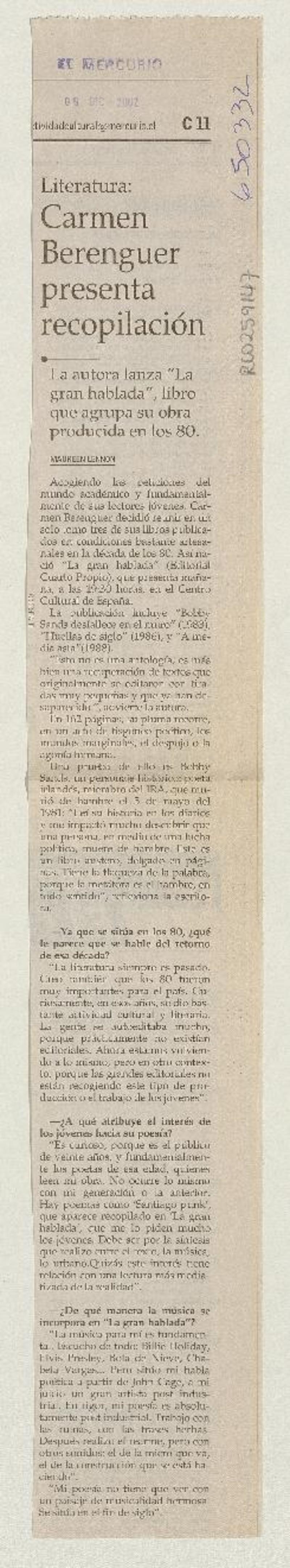 Carmen Berenguer presenta recopilación [artículo] Maureen Lennon