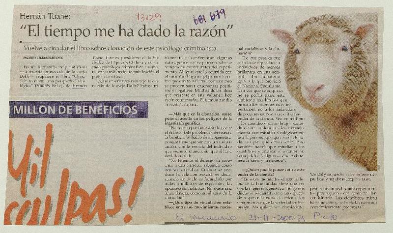 Autores chilenos - entrevista - Tuane, Hernán - Clonación humana, una perspectiva sicológica