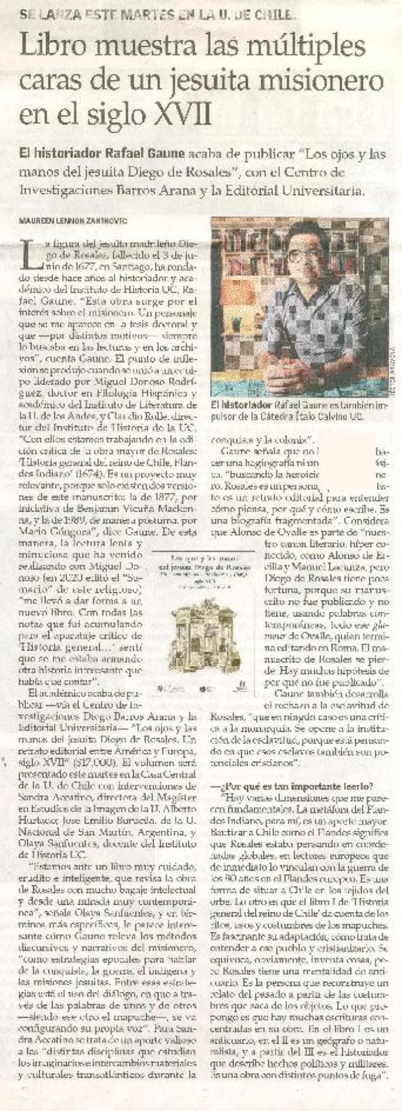 Libro muestra las múltiples caras de un jesuita misionero en el siglo XVII [entrevista] [artículo] : Mauren Lennon Zaninovic.