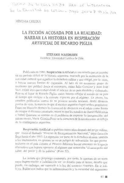 La Ficción acosada por la realidad: Narrar la historia en respiración artificial de Ricardo Piglia [artículo] Stefanie Massmann.