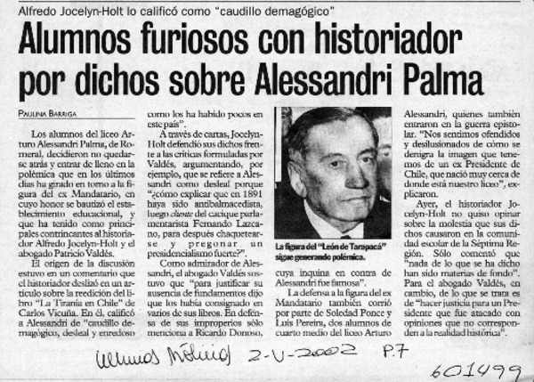 Alumnos furiosos con historiador por dichos sobre Alessandri Palma [artículo] Paulina Barriga