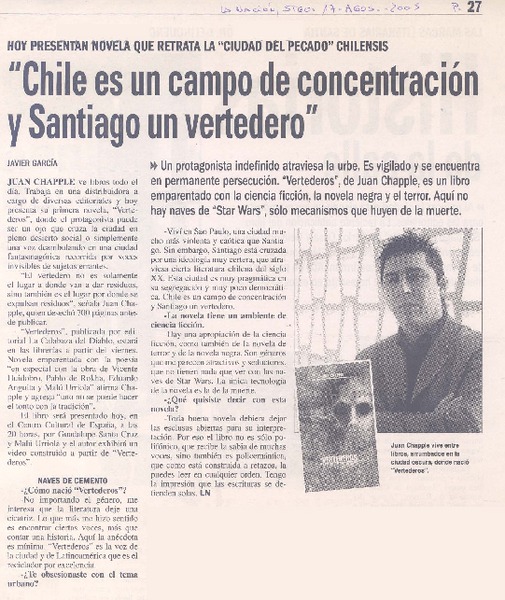 Hoy presentan novela que retrata la "Ciudad del pecado" chilensis : "Chile es un campo de concentración y Santiago un vertedero" [artículo] Javier García.