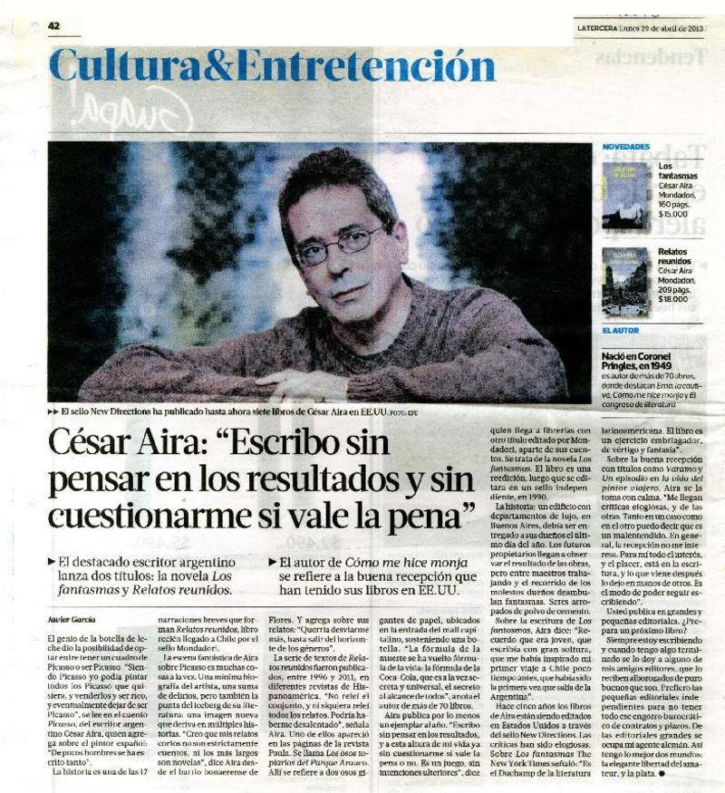 César Aira: "Escribo sin pensar en los resultados y sin cuestionarme si vale la pena" [artículo] Javier García.