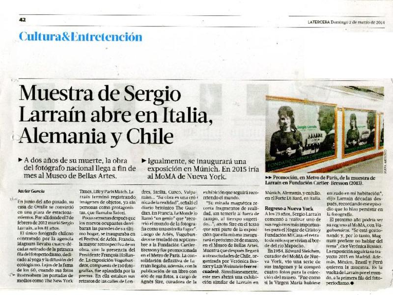 Muestra de Sergio Larraín abre en Italia, Alemania y Chile [artículo] García, Javier