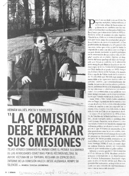Hernán Valdés, poeta y novelista : "La Comisión debe reparar sus omisiones" [entrevista] [artículo] por María Teresa Cárdenas.