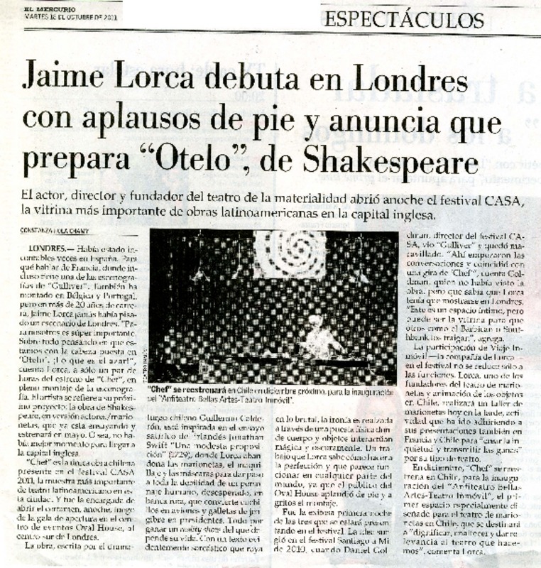 Jaime Lorca debuta en Londres con aplausos de pie y anuncia que prepara "Otelo", de shakespeare [artículo] Constanza Hola Chamy.