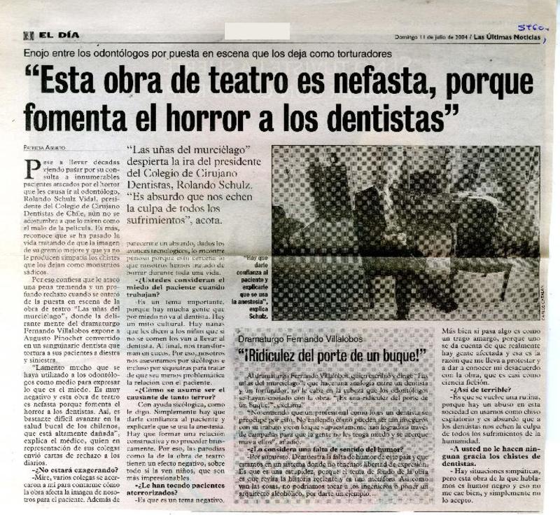 "Esta obra de teatro es nefasta, porque fomenta el horror a los dentistas" Enojo entre los odontólogos por puesta en escena que los deja como torturadores [artículo] : Patricia Aburto Lorca.