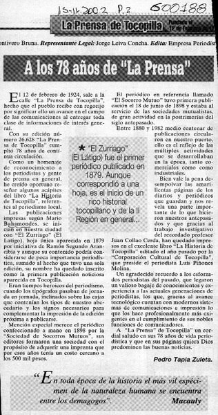 A los 78 año de "La Prensa" [artículo] Pedro Tapia Zuleta