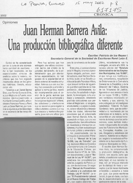 Juan Herman Barrera Avila, una producción bibliográfica diferente [artículo] Patricio de los Reyes Ibarra