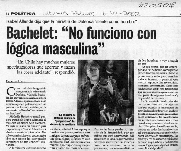 Bachelet: "no funciono con lógica masculina" [artículo] Macarena López.