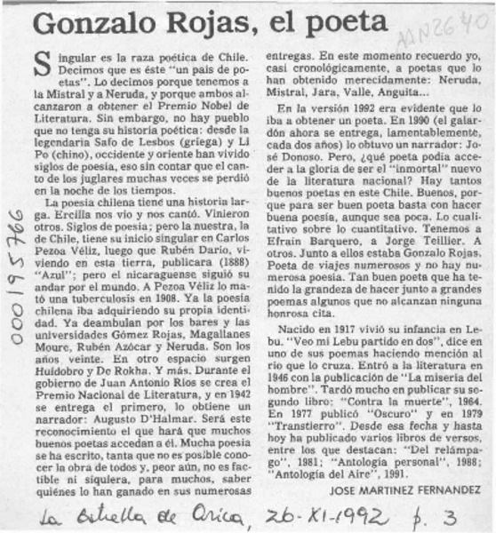 Gonzalo Rojas, el poeta [artículo] José Martínez Fernández.