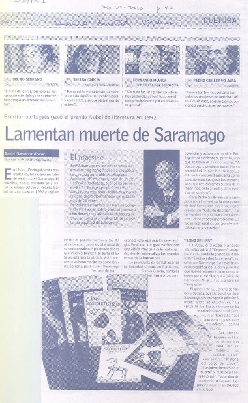 Lamentan muerte de Saramago [artículo] Daniel Navarrete Alvear.
