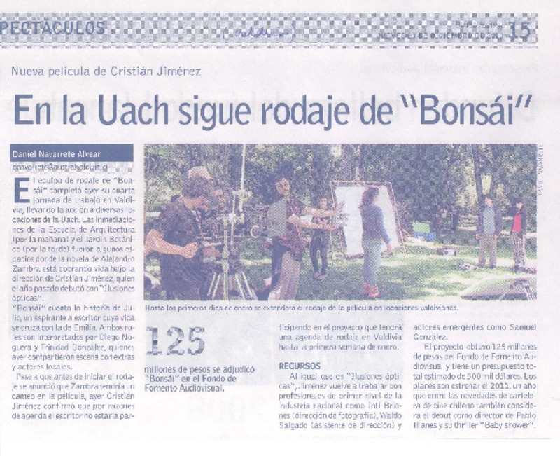 En una Uach sigue rodaje de "Bonsái" [artículo] Daniel Navarrete Alvear.