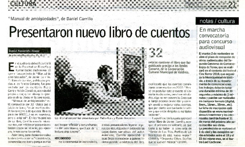 Presentaron nuevo libro de cuentos [artículo] Daniel Navarrete Alvear.